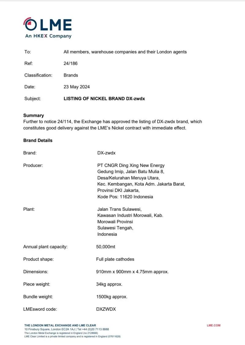 On May 23, 2024, the London Metal Exchange (LME), the world's largest base metals trading center, announced that the "DX-zwdx" brand electrolytic nickel produced by Indonesia's CNGR Dingxing New Energy Co., Ltd. has been certified and registered by the LME, officially becoming an LME nickel delivery brand. The announcement means that pure nickel produced in Indonesia has obtained a "global passport," making it the first LME nickel delivery brand in Southeast Asia. This achievement not only strengthens the global influence of Indonesia's nickel industry but also promotes the development of the nickel industry in both Indonesia and Southeast Asia.