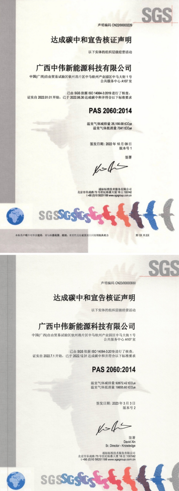 SGS是國際碳排放管理公認的測試、檢驗和認證機構(gòu),此次認證由SGS依據(jù)ISO 14064-3:2019標準,于2022年9月與2023年2月兩次對中偉欽州產(chǎn)業(yè)基地生產(chǎn)運營過程中排放產(chǎn)生的溫室氣體數(shù)據(jù)進行統(tǒng)計與核查,各項數(shù)據(jù)均經(jīng)過詳細評估、統(tǒng)計與現(xiàn)場審核,同時對相關(guān)數(shù)據(jù)聲明、減排計劃及中和方案進行嚴謹細致的文件審查、現(xiàn)場評審和技術(shù)評審,最終符合PAS 2060:2014的標準要求,證實中偉欽州產(chǎn)業(yè)基地達成碳中和。