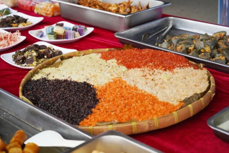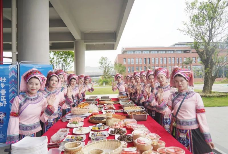 伴隨著此起彼伏、高遏行云的歌聲,另一邊的長桌美食盛宴也拉開帷幕,有象征吉祥如意、五谷豐登的五色糯米飯;有清香四溢、滿口香甜的各色水果;有清甜軟糯、蘊(yùn)含著壯族人民對美好生活向往的粽子;還有各式各樣、滿口留香的面點(diǎn)......食材豐富,色香味俱佳,把壯鄉(xiāng)民俗特色展現(xiàn)得淋漓盡致。