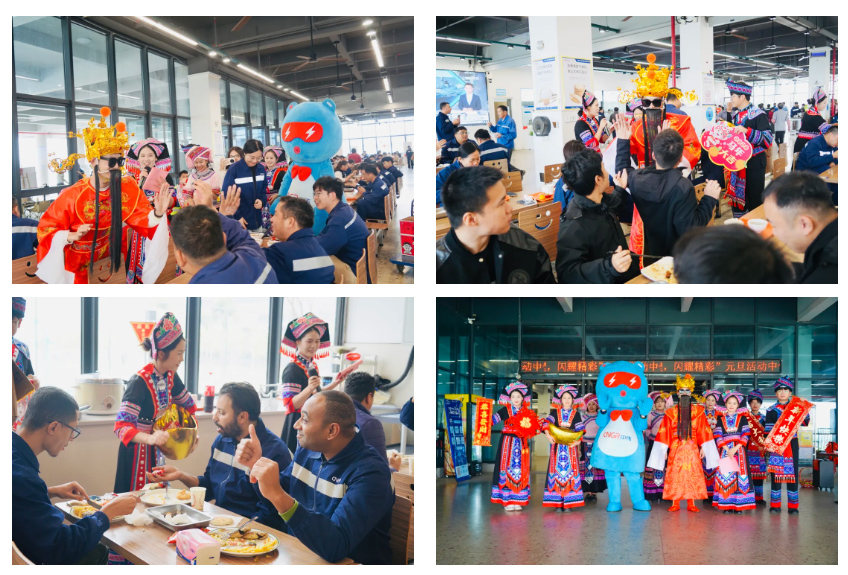 基地形象大使團(tuán)也迎來了“驚艷首秀”。他們與活潑可愛的“鋰電寶寶”、喜氣洋洋的“財神爺”共同集結(jié),組成了一支活力滿滿的送福小分隊。在濃厚的節(jié)日氛圍中,這支“福氣天團(tuán)”通過創(chuàng)意十足的互動與沉浸式文化體驗,正式拉開了基地辭舊迎新、共赴新篇的華麗序幕?!盎芋w驗巡游”環(huán)節(jié)點燃了全場最高熱情。員工們爭相與“財神爺”大力擊掌、擁抱“金元寶”,在響亮的掌聲中“掌”握新年好彩頭。“接福挑戰(zhàn)”更是一場智慧與默契的較量,大家妙語連珠,接力送出“一馬當(dāng)先”的節(jié)日祝福。摩洛哥同事也深受感染,熱情加入其中,中外伙伴歡聚一堂,在歡聲笑語間繪就了一幅跨越國界的文化交融新春圖景。