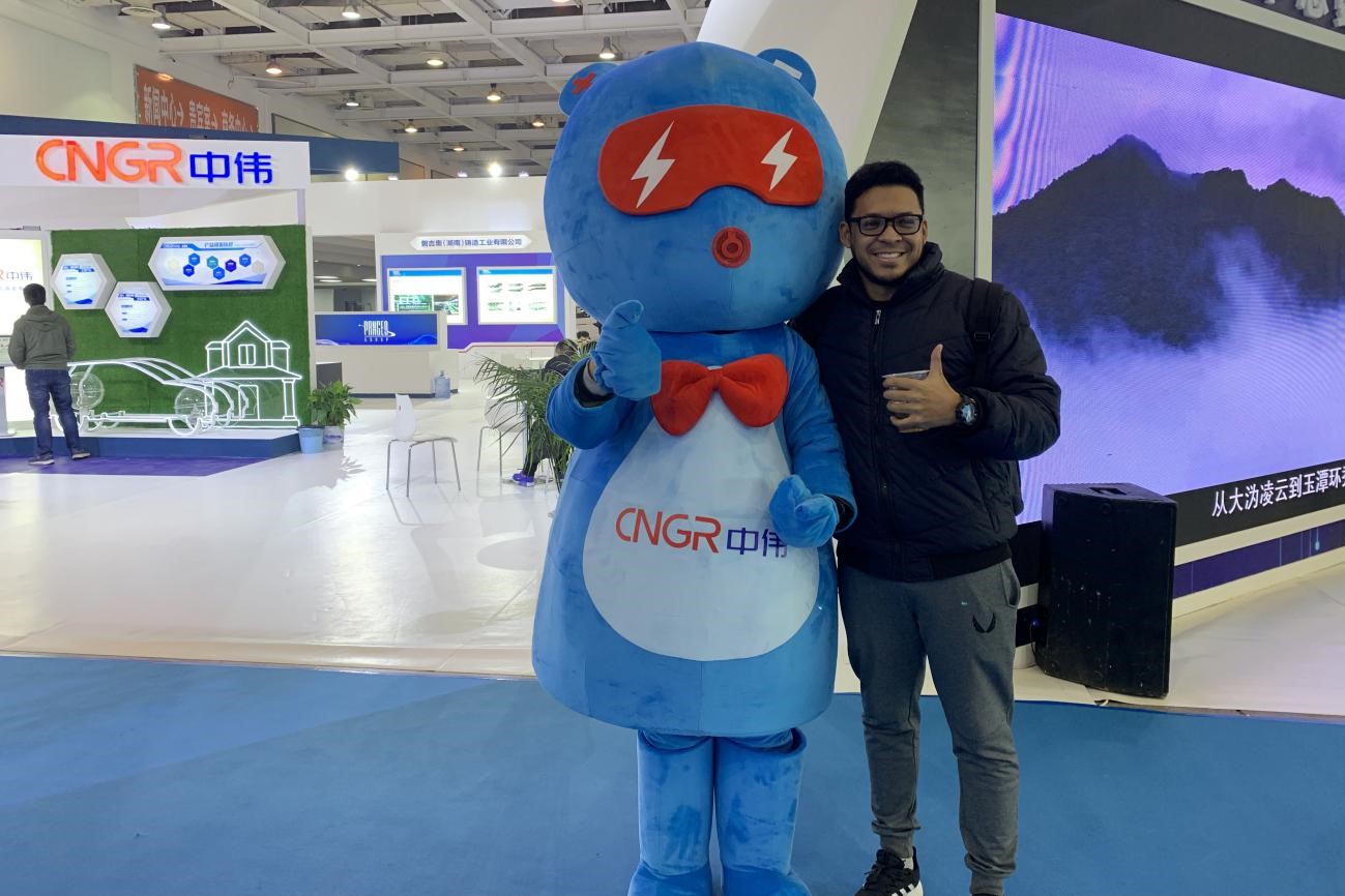 參展觀眾與中偉新材料吉祥物“鋰電寶寶”合影