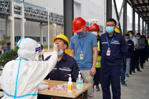 一同堅(jiān)守在抗疫一線的還有南部產(chǎn)業(yè)基地安環(huán)部。在接到防疫命令后的第一時(shí)間,他們緊急響應(yīng),連夜安排全體員工和施工方人員進(jìn)行核酸檢測(cè),在1天內(nèi)完成了全部4000多名員工的核酸檢測(cè),并安排人員在基地進(jìn)行24小時(shí)值守,勸阻非必要人員進(jìn)出基地,協(xié)助維持秩序,收集和了解基地員工的緊急需求,筑牢疫情防線。以人為本 眾志成城兵馬未動(dòng),糧草先行。南部產(chǎn)業(yè)基地后勤保障組連日來與時(shí)間賽跑、克服困難,圍繞園區(qū)人員飲食保障、廠區(qū)公共區(qū)域全覆蓋的保潔消殺、防疫物資的調(diào)度發(fā)放、管牢疫情防控大門等多項(xiàng)工作,全力做好服務(wù)保障。