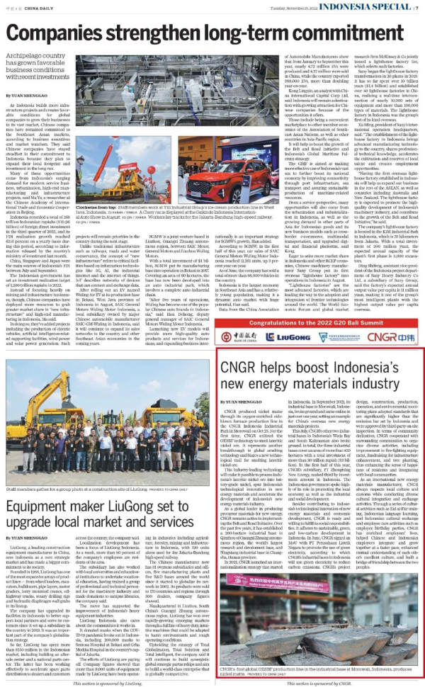 作為國(guó)家英文日?qǐng)?bào),中國(guó)日?qǐng)?bào)(China Daily)在11月15日當(dāng)天發(fā)行的G20特刊中,聚焦中偉在印尼的產(chǎn)業(yè)發(fā)展,用四分之一版面大幅刊登題為《CNGR helps boost Indonesia's new energy materials industry》(中偉助力印尼新能源材料產(chǎn)業(yè)發(fā)展)的重點(diǎn)報(bào)道。